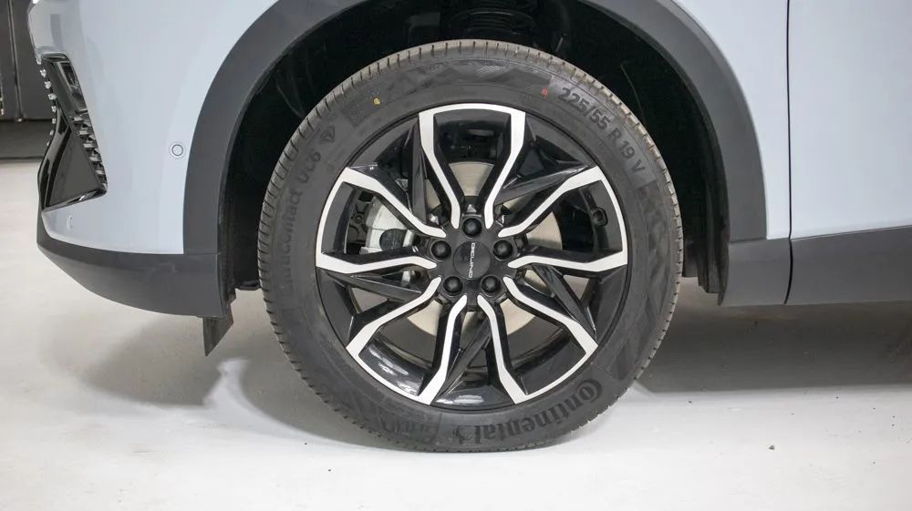其他細節(jié),我們所拍攝的這臺魔方輪轂樣式為雙五幅花瓣式,輪胎則使用了馬牌UC6型號,尺寸為225/55 R19。