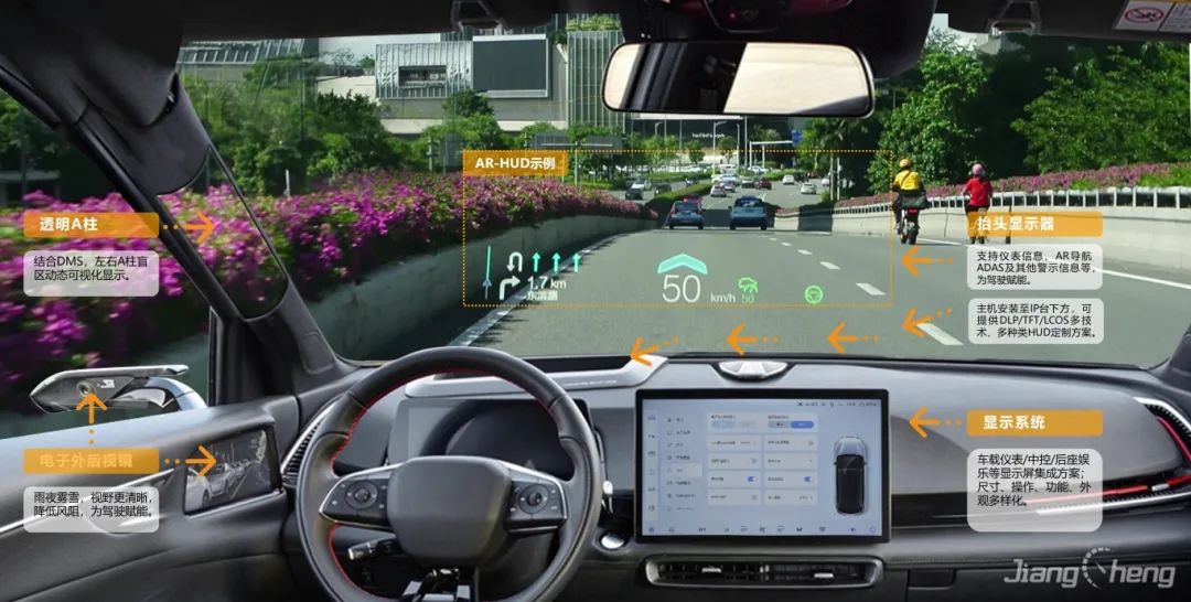 Based on the complex variable environment, the opto-mechanical design of large size and small volume is completed, and the multi-data fusion algorithm is used to realize the superposition and fusion display of assisted driving information such as navigation and ADAS on the real road conditions, which improves driving safety and provides more cool and a smarter driving experience.